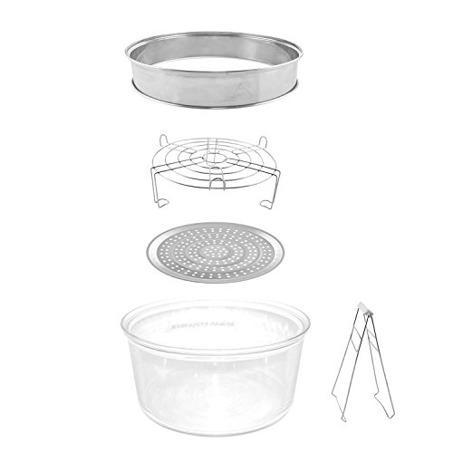 - Accessories included: two-way rack, steamer, tongs, extender ring