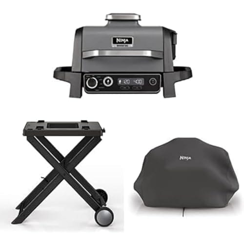 Bundle of Ninja Woodfire Electric BBQ Grill & Smoker, 7-in-1 Outdoor Barbecue Grill & Air Fryer OG701UK + Official Folding Grill Stand + Official Water Resistant Grill Cover Anti-Fade