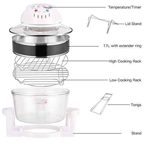 - 【INCLUDED ACCESSORIES】Our convection oven comes with tongs and 2 stainless steel cooking racks for up to 3 layers of cooking. Grill on the high rack or roast/bake on the low rack. Besides, the oven comes with an extender ring so that you can cook larger food. A separate lid stand can keep the lid of the pot clean and tidy, offering more convenience.