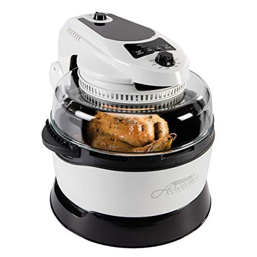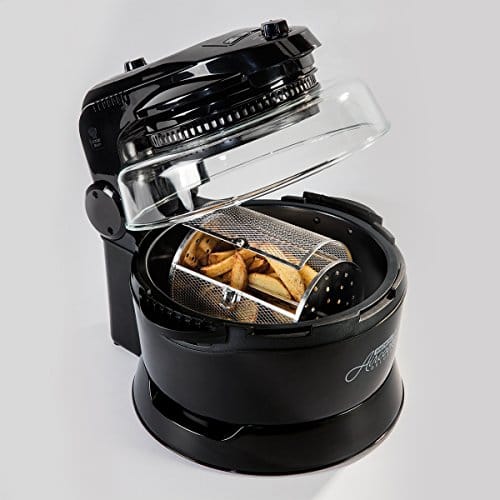 Halowave Aircooker Deluxe combines fan-assisted halogen heat technology with a built-in rotisserie for fast, perfectly cooked results in less time – every time! Halowave harnesses the power of halogen heat combined with air provided by powerful fans to perfectly circulate the cooking power all around your food. Thanks to the fast, efficient way that halogen heat technology cooks, you can still enjoy food just the way you like it but cooked in a healthier, faster way. The 360° degree glass bowl means you can always see what you’re cooking, and the easy-to-use digital controls let you set the cooking time and temperature in advance, or while you cook, so you never let the heat out of the oven or burn your food! Included in this offer there’s the specially designed rotisserie Steak Rack for flat or delicate food like steak, burgers or fish fillets, or multiple small items like prawns and even butter-basted asparagus. There’s also a versatile rotisserie Skewer Drum that holds 8 stainless steel skewers at once! The non-stick Frying Pan sits neatly inside your Halowave Aircooker Deluxe as well as on the high or low rack position. The clever Oil Sprayer will evenly coat your food in a fine mist of oil for a light, healthy touch of cooking oil. This way you can fry, bake, roast and get even, crispy cooking in a healthier, easier way with less spills and drips and less time spent cleaning. Plus, it’s dishwasher safe and the main unit is self-cleaning! Add detergent and water and watch it wash itself clean. SET INCLUDES: Halowave Aircooker Deluxe, High/Low Rack, Spindle, Forks, Airfrying Basket, Tongs, Basket Hook & Stand, Recipe Guide, User Guide, Oil Sprayer, Frying Pan, Steak Rack, Skewer Drum & Roasting Pan. POWER: 1500W. COOKING CAPACITY: 11.37L. BOWL CAPACITY: 8.35L.