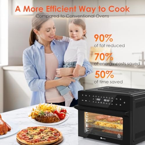 - 90% Less Oil Technology: Crispy Outside, Tender Inside, Guilt-Free, Revolutionary 360° hot air circulation replaces traditional frying. Reduces oil in fries or chicken wings by 90% while delivering crispier results. Dual heating elements (top + bottom) with 1800W power – no preheating required. Cooks family meals in 20 minutes (50% faster than conventional ovens)