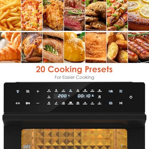 - 20 Presets + Manual Mode: From Beginner to Pro Chef: 20 smart menus (pizza, cake, fish, etc.) automatically adjust temperature and time. Precise control (80–230°C/175–450°F, 120-minute max timer). Pause function for adding ingredients mid-cook (e.g., honey glaze on ribs). Zero flavor transfer between foods