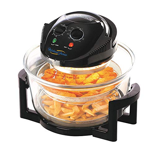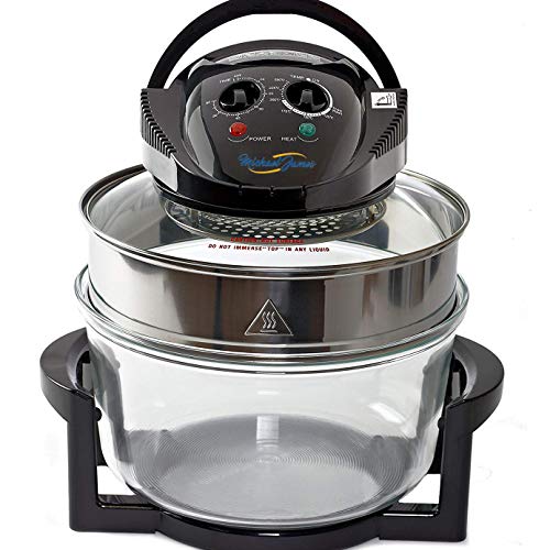 ✔Large 12/17 Litre Premium Convection Halogen Oven in Black FREE extras and full TWO YEAR WARRANTY !!. ✔ 1 High Rack 1 Low Rack ✔ Lid Holder, nice to have somewhere to stand that hot lid! ✔ Extender ring to adjust you cooker from 12 to a full 17 litre capacity ✔ Tongs, specially designed to lift out the racks when hot. ✔ High capacity 12L/17L Quality Halogen Oven allows you to roast, fry, steam, grill, bake and more. ✔ Powerful halogen heating and convection system circulates heated air evenly around your food cooking it quickly and evenly. ✔ Features a handy 0-60 minute timer. Great for cooking low fat foods or for those on a Diet as it seals in natural nutrition, moisture & flavour of the foods. Michael James Halogen ovens come complete with a full set of accessories including Tongs, rack & lid-holder and instruction booklet. Main Features of the Michael James Premium Halogen oven: * Timer Function. * Can be set to cook for 0-60 minutes. * Safety switch, *The Michael James Premium halogen oven switches off as soon as the handle is moved into the raised position, ensuring the lid will not operate when the lid is removed. * Variable Temperature Control Ranges from between 65 – 250 °C. * Ideal for Steaming, cooking, grilling, baking, roasting and air frying Build Quality: Michael James Premium oven has a stainless coated bulb cover. Many competitors have painted covers which start to flake in time and fall in your food. The cable has heat resistant cover on first 250mm of cable to prevent plastic cable from melting if in contact with the glass: Package Contents: 1 x Premium Halogen Oven 1 x Extender Ring (adds an extra 5L capacity) 1 x Lid Stand 1 x Tray removal tongs 1 x High Rack 1 x Low Rack