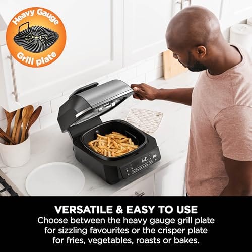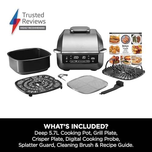 - Ninja 5-in-1 Indoor Grill & Air Fryer, 5 Cooking Functions, Make Up to 4 Burgers, 5.7L capacity, Low Smoke, Includes Digital Meat Thermometer, Black/Silver, EG351UK